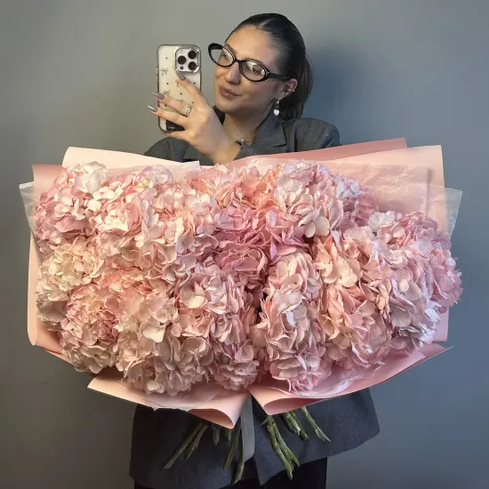 Букет гортензий розового оттенка: упругих, пышных и свежих, украшенных упаковкой радует нас в любое время года, даже когда сезон цветения еще не начался!В букете 15 крупных гортензий и стильная упаковка.