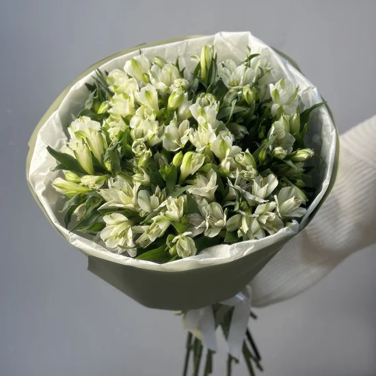 Стойкий букет из 21 нежной альстромерии белого оттенка подчеркнет теплые чувства, обрадует получателя и поднимет настроение. Пышные бутоны альстромерий, раскрывающиеся один за одним, имеют очаровательную развернутую форму. Размер букета из 21 белой альстромерии - около 50 см 7050