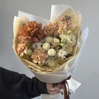 В букетах в теплых оттенках от Florcat органично сочетаются нежные карамельные розы, абрикосовые герберы и лимонно-кремовые хризантемы, дополненные экологичной зеленью и колосками, что создаёт уютную, солнечную атмосферу даже в пасмурный день. Мы используем только самые свежие цветы, а авторские приемы оформления включают крафт-бумагу и легкие акценты сухоцветов, чтобы подчеркнуть натуральный стиль каждой композиции.