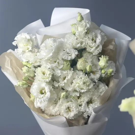 Букет из 5 веточек изящной эустомы белого цвета. Множество нежных бутонов, собранных вместе в трогательный букет, помогут выразить ваши нежные чувства.Размер букета из 5 эустом - около 30 см