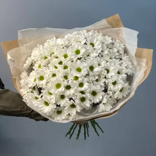 Этот очаровательный букет составлен из 15 веточек кустовых хризантем сорта Bacardi, которые своей нежной красотой напоминают солнечные полевые ромашки. Каждый цветок - это настоящее произведение природы с множеством изящных лепестков, собранных в пышные соцветия.