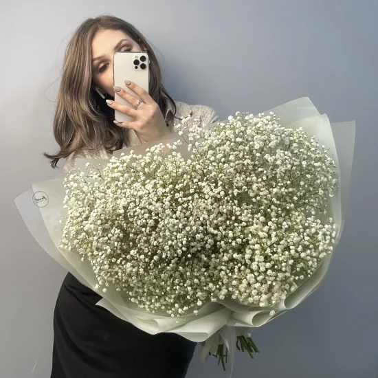 Невероятно пышный букет из 15 веточек душистой гипсофилы белого оттенка, украшенных стильной упаковкой, поднимет настроение и приятно удивит.Гипсофила - стойкий и пышный цветок, на веточке которого множество маленьких шариков-соцветий, имеющих приятный медовый аромат.