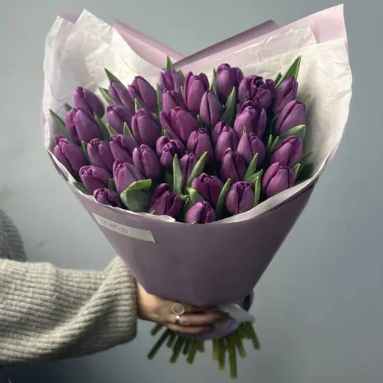 Букет из 35 тюльпанов фиолетового оттенка - пышный весенний подарок. Тюльпаны - хрупкие цветы, обладающие особым шармом. Букеты тюльпанов создают нежное весеннее настроение, их приятно дарить и получать!Тюльпаны очень красиво раскрываются, превращаясь из плотных бутонов в пышные цветки.