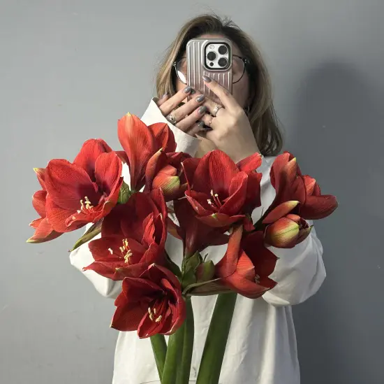 Букет из 3 крупных бордовых амариллисов, украшенный упаковкой в нашем фирменном стиле. Амариллис - пышный и стойкий цветок, бутоны которого раскрываются в тепле один за одним, даря настроение на неделю вперед!Размер букета из 3 амариллисов - около 40-50 см 3150