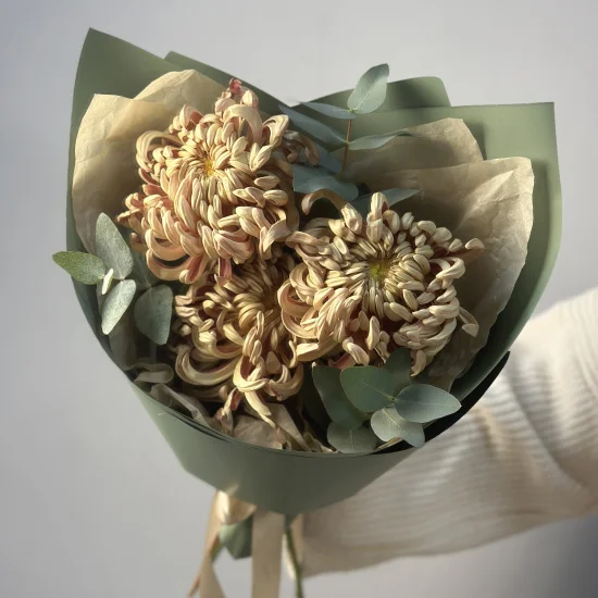 Букет из 3 крупных фактурных хризантем сорта Vienna, имеющих нежный персиковый оттенок. Хризантемы - одни из самый стойких цветов, что делает их любимицами многих.Размер букета из 3 хризантем - около 25-30 см 3540