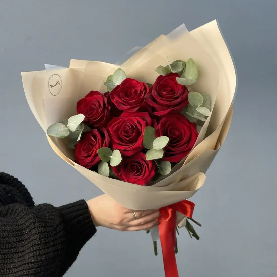 Букет из 7 бархатных роз сорта Explorer, украшенных веточками эвкалипта и минималистичной упаковкой. Розы сорта Explorer обладают отличной стойкостью и нежным цветочным ароматом.Идеальная классика для любого повода!