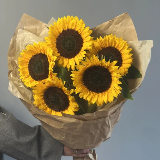 Солнечный букет из 5 крупных сезонных подсолнухов в стильной крафт-бумаге.Размер букета подсолнухов - около 45 см