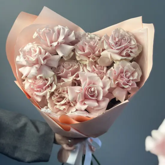Букет из 11 премиальных роз сорта Pink Mondial нежного розового оттенка поможет передать ваши нежные чувства или слова благодарности. Крупные розы со множеством нежных лепестков, вручную вывернутых нашими флористами, обладают нежностью и легким ароматом.