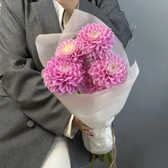 Букет из 5 махровых георгинов ярко-розового оттенка в стильной упаковке - сезонное предложение. Изящные крупные георгины, украшенные упаковкой, поднимают настроение!