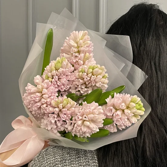 Гиацинты - пышные весенние цветы с интересной фактурой и нежным ароматом.Размер букета из 7 гиацинтов, украшенных стильной упаковкой - около 25 см 2240