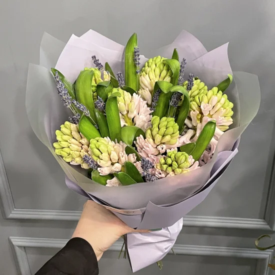 Размер букета из 9 гиацинтов, украшенных лавандой и стильной упаковкой - около 35 см