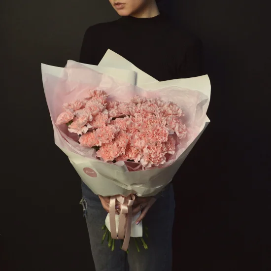 Букет из 31 гвоздики нежно-розового оттенка: кружевной, стойкой и ароматной, упакованной в стильную пленку - нежное украшение любого события. Гвоздики смотрятся лаконично, изящно и трепетно.Размер букета из 31 гвоздики - около 50 см 6020