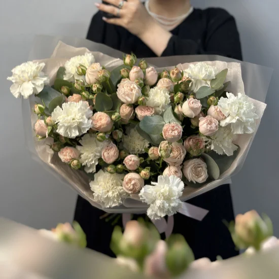 Чувственный дуо-букет с крупной кустовой пионовидной розой Bombastic теплого кремового оттенка и кружевной белой гвоздикой.Размер дуо-букета - около 50 см