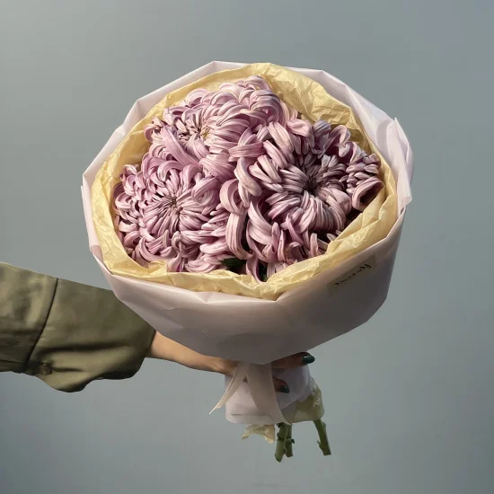 Букет из 3 крупных фактурных хризантем сорта Vienna, имеющих нежный сиреневый оттенок. Хризантемы - одни из самый стойких цветов, что делает их любимицами многих.Размер букета из 3 хризантем - около 25-30 см 3150