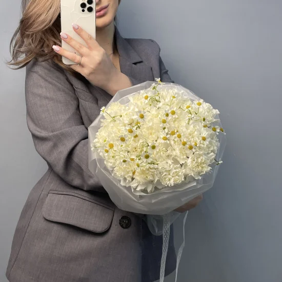 Воздушный дуо-букет с кружевными гвоздиками и игривой матрикарией.Размер дуо-букета - около 30 см
