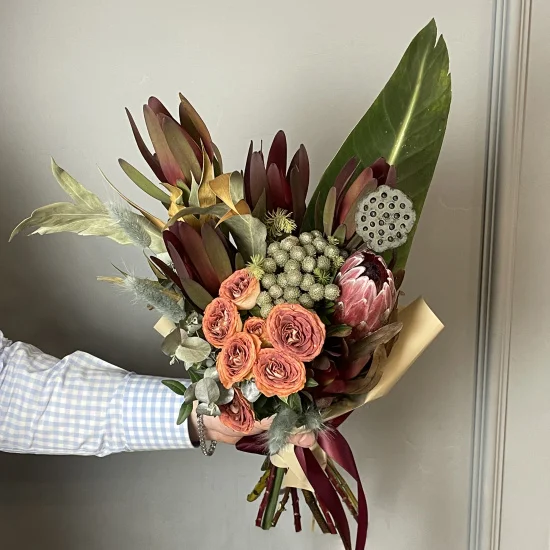 Мужской букет, выполненный в теплых бордовых оттенках с протеей, леукодендроном (сафари), крупными листьями стрелиции, коробочками лотоса, брунией, эвкалиптом и изящной пионовидной розой.Размер мужского букета - около 50 см