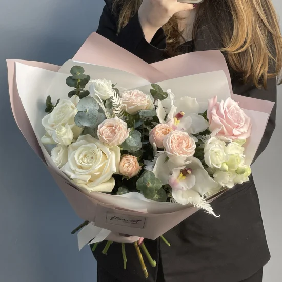 Сборный букет Bloom, выполненный в свежих весенних оттенках, поможет передать самые трепетные и нежные чувства. В составе: орхидеи, пионовидные розы, эустома, гвоздики, папоротник и эвкалипт. Размер сборного букета - около 40-45 см