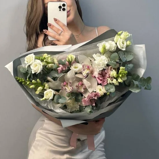 Совершенство — изящный сборный букет, составленный с роскошными тропическими орхидеями, медовой маттиолой лилового оттенка, эустомой и веточками эвкалипта.Размер сборного букета Совершенство М - около 45 см