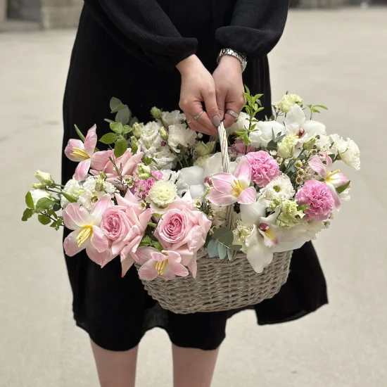 Нежная весенняя корзина с распускающимися веточками березы, бабочками тюльпанов, роскошными орхидеями, шариками эустомы, стойкими гвоздиками, хамелациумом и крупными сортовыми розами мгновенно окунет в атмосферу майского сада, теплого ветра и нежного согревающего солнца.Размер корзины - около 60см