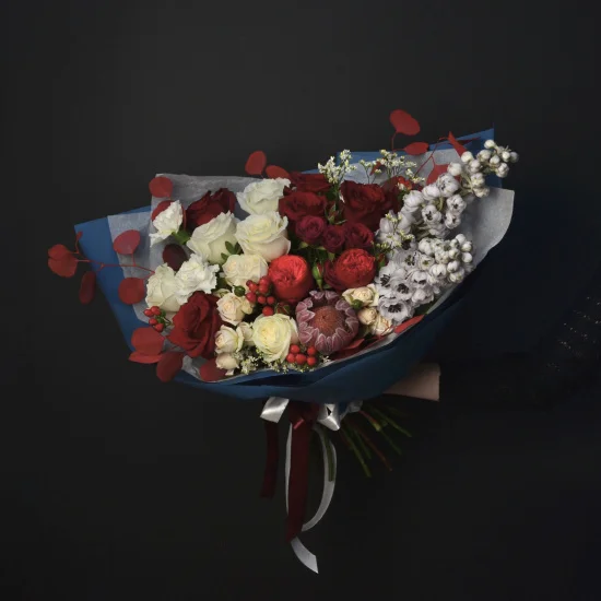 Сборный букет Матовая помада из раздела "Премиум", собранный из роскошных пионовидных и классических роз, дельфиниума, экзотических протей, гипсофилы, веточек эвкалипта красного оттенка и ягодок гиперикума, создает романтичное настроение.Пышный и стильный сборный букет в красно-белых оттенках порадует любую даму!