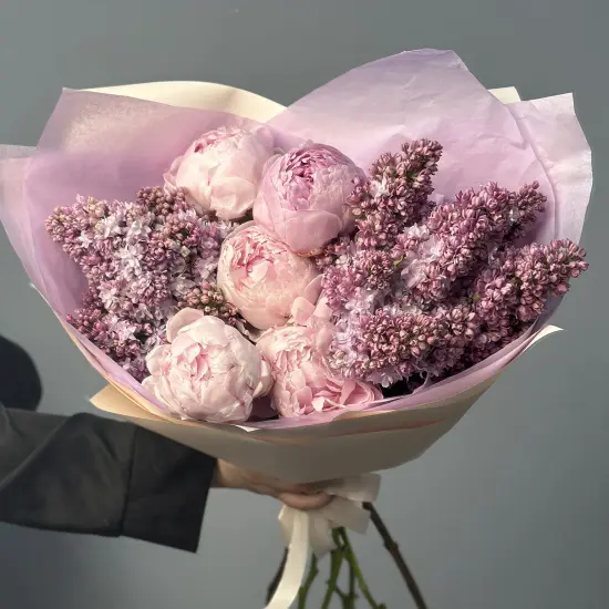 Пожалуй, самый ароматный букет сезона: пышные благоухающие шарики-пионы, раскрывающиеся в тепле один за одним, и облачка сортовой сирени, собранные в изящный букет, помогут выразить ваши чувства и запомнятся надолго.Размер дуо-букета M - около 40 см 10650