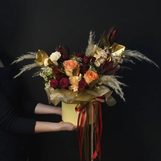 Букет в шляпной коробке Golden из раздела "Премиум", в составе которого сошлись бордовые и персиковые пионовидные розы, золотые листья рускуса, пампасная трава и маттиола, собран на флористической губке.