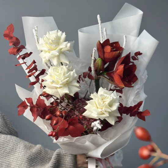 Букет Снежный ноябрь - олицетворение внезапно начавшейся зимы. Алые оттенки сменяются снегом, заметающим все вокруг. Изящный состав порадует получателя по поводу и без: стойкие амариллисы, французские розы, осенний эвкалипт, ягодки шиповника и веточки берга окунают в атмосферу приближающегося декабря!Высота букета - около 55 см, ширина - около 35