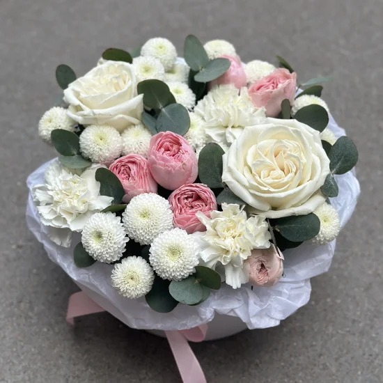 Этот очаровательный букет – настоящее воплощение романтики и изысканности. В шляпной коробке гармонично сочетаются пышные пионовидные розы, воздушные гвоздики, нежные шарики сортовых хризантем и легкие веточки эвкалипта. Такой подарок идеально подойдет для выражения самых теплых чувств – будь то признание в любви, поздравление с праздником или просто знак внимания без повода.