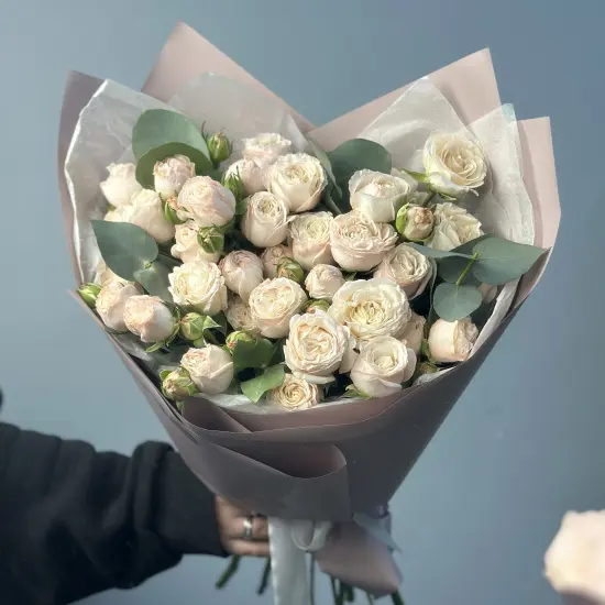 Букет из 9 кустовых пионовидных роз Bombastic и эвкалипта