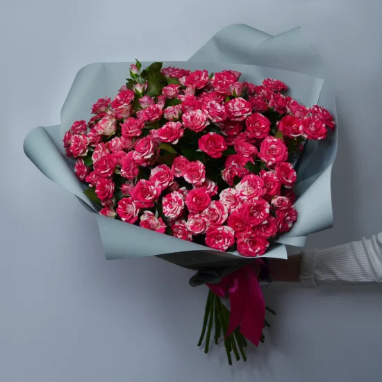Букет из 25 ярких кустовых роз сорта Fireworks, обладающих бутоном необычного малинового оттенка с белыми вкраплениями. Букеты кустовых роз пышные, изящные, готовые создать прекрасное настроение, приятно удивить и запомниться надолго!Диаметр букета из 25 кустовых роз - около 50 см