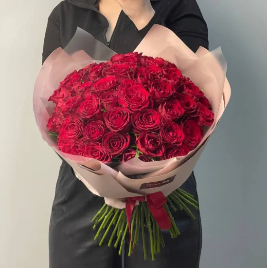 Диаметр букета из 51 красной розы высотой 40см (Кения) - около 50 см
