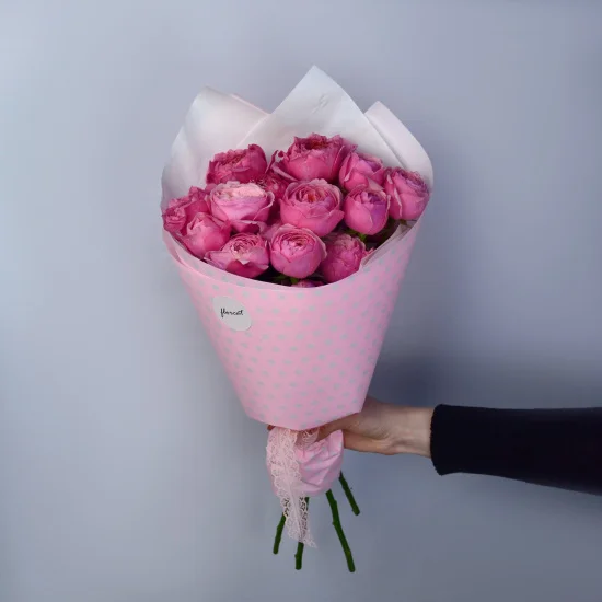 Размер букета из 5 кустовых пионовидных роз Juliet Cerise - около 20-30 см