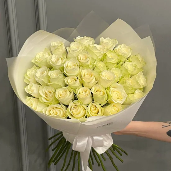Букет из 35 роз белого оттенка, привезенных прямиком из солнечной Кении. Плотные бутоны белых роз в раскрытии становятся нежно-кремовыми и очень пышными.Нежный букет из 35 роз подарит любой девушке отличное настроение, приятно удивит и запомнится надолго!