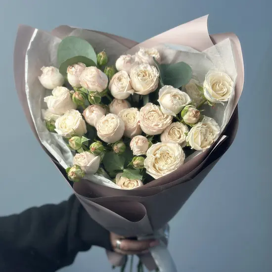 Букет из 5 кустовых пионовидных роз Bombastic и эвкалипта