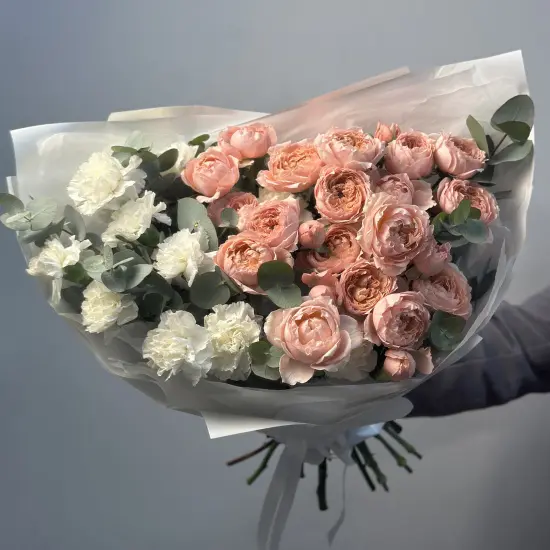 Очаровательное дуо: пушистые шарики гвоздик и ажурные кустовые розы с пионовидным раскрытием juliet. Букет украшен веточками эвкалипта и уже готов радовать ваших родных!Размер букета - около 45-50см 9540