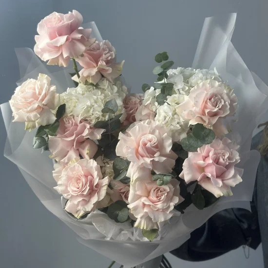 Нежный дуо-букет из премиальных роз сорта Pink Mondial нежно-розового оттенка, пышных белых гортензий и эвкалипта поможет передать ваши нежные чувства. Крупные розы со множеством нежных лепестков, вручную вывернутых нашими флористами, обладают нежностью и легким ароматом.Размер дуо-букета - около 60 см в ширину 13340