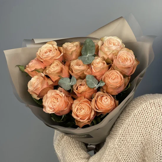 Букет из 15 стойких ароматных роз сорта Kahala с персиковой сердцевиной, украшенных веточками эвкалипта и минималистичной крафтовой упаковкой. Розы сорта Kahala обладают отличной стойкостью, нежным цветочным ароматом и удивительным свойством менять цвет в раскрытии, становясь более светлыми и нежными. Размер букета из 15 роз Kahala - около 40 см 7940