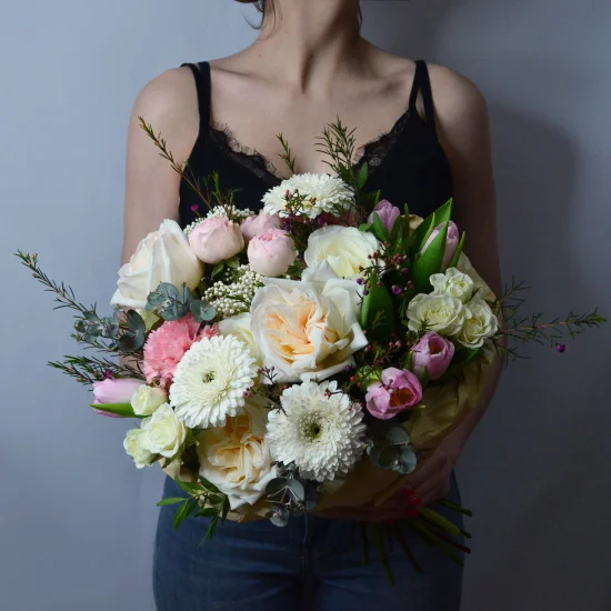 Безе — круглый сборный букет в светлых тонах. В составе букета сошлись крупные пионовидные розы, герберы, ваксфлауэр, тюльпаны и нежные кустовые розочки. Букет упакован в нежную крафтовую бумагу.Классическая круглая форма букета позволяет разместить его в центре стола. Букет Безе украсит любое помещение нежным ароматом и изяыщным внешним видом.