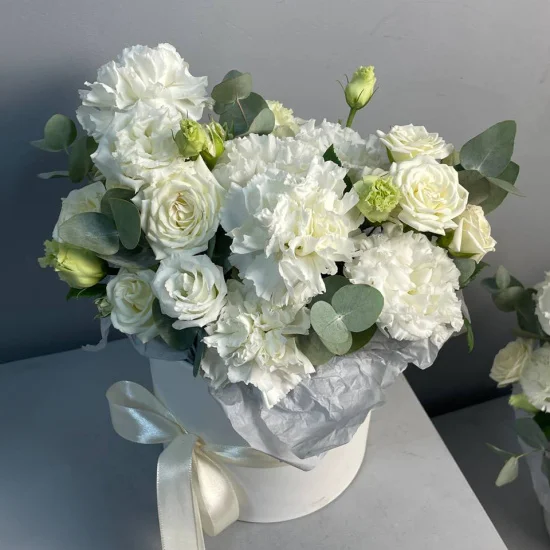 Нежный цветочный набор в шляпной коробке, выполненный в свежих бело-зеленых тонах. В составе: кустовые розы, веточки эвкалипта, воздушная эустома и ажурные гвоздики.Размер композиции - около 25 см