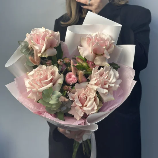 Клубничный сироп - свежий букет, наполненный нежными цветами. В составе: трепетные сортовые розы, стойкие альстромерии, пушистый лагурус и веточки эвкалипта.Размер сборного букета Клубничный сироп - около 40 см