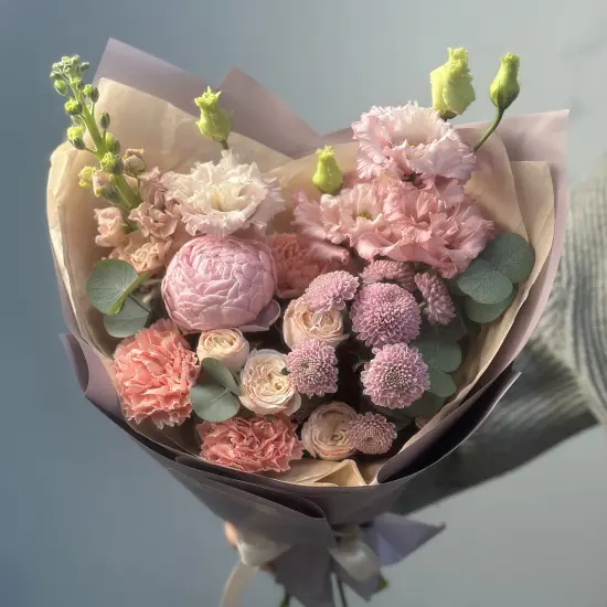Лавандовый раф — изящный сборный букет с сезонным пионом, кремовыми розами, сортовыми хризантемами, кружевными гвоздиками, пышной эустомой, ароматной маттиолой и веточками эвкалипта. Оттенки букета напоминают всеми любимый напиток - кофе со сливочной пенкой и лавандовым сиропом.Размер сборного букета Лавандовый раф S - около 30 см