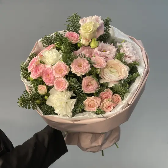 Изящный букет с зимним настроением, составленный из натуральных веточек датской ели, кустовых роз, пышных гвоздик и стойких лютиков-ранункулюсовРазмер букета - около 30 см