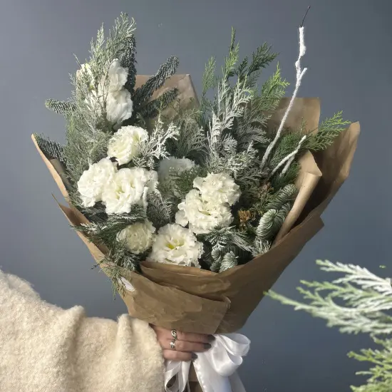Нежный букет с зимним настроением из натуральных веточек датской ели, воздушной эустомы и бергаРазмер зимнего букета с эустомой - около 35 см