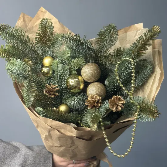 Пышный зимний букет с пушистыми еловыми веточками, шишечками и уютным зимним декором.Размер зимнего букета Golden S - около 30 см