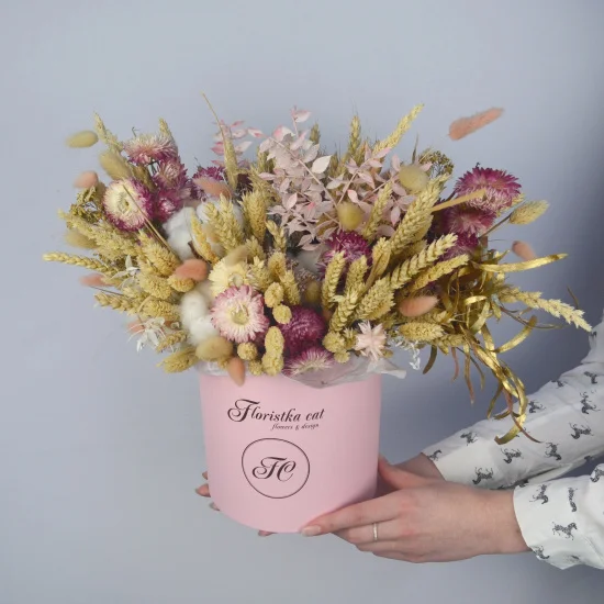 Интерьерная композиция из сухоцветов в шляпной коробке - стойкое и стильное украшение интерьера, в составе которой сошлись гелихризум, колоски, лагурус, стабилизированный рускус и соцветия хлопка.Размер букета в шляпной коробке - около 50 см
