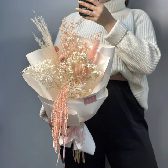 Букет выполнен в нежных оттенках белого и розового из россыпи стабилизированных цветов и сухоцветов. Сухоцветы приятно удивляют стойкостью и не требуют специального ухода. Достаточно разместить букет в подходящем месте и можно наслаждаться его красотой долгие месяцы!Размер букета из сухоцветов - около 25 см