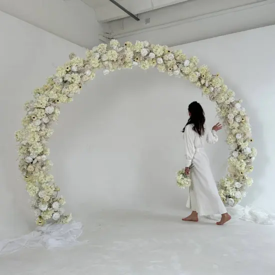 Круглая белая арка, полностью заполненная цветами.В стоимость входят: арка, цветочный декор, ткани, монтаж и демонтаж арки, доставка в пределах КАДа. Арка предоставляется в аренду на сутки "под ключ".