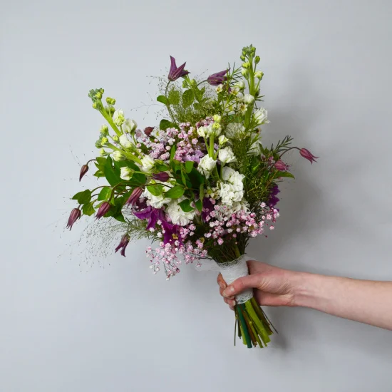 Свадебный букет невесты, в составе которого использованы гипсофила, маттиола, клематисы, ваксфлауэр и сезонная зелень, исполнен в полевом стиле. На фото - пример свадебного букета, который наши опытные флористы исполнят для Вас с любыми изменениями бюджета, состава, цветовой гаммы и размера, чтобы улыбка на Вашем лице сияла на протяжении всего торжества. Также мы с радостью подберем подходящую по стилю бутоньерку, которая дополнит образ Вашей красивой пары.Мы понимаем, что свадьба - особенный день, который должен пройти идеально. Часть Вашей предсвадебной подготовки, а именно создание совершенного букета, мы берем на себя.