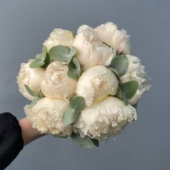 Представляем вашему вниманию изысканный свадебный букет, в котором гармонично сочетаются пышные белоснежные пионы и нежные веточки эвкалипта. Этот шедевр флористического искусства выполнен в лучших традициях классического стиля, но при этом выглядит современно и свежо.