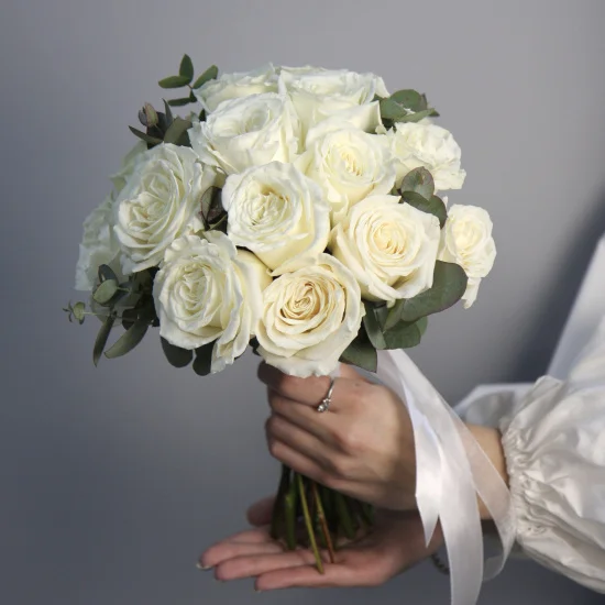 Свадебный букет невесты из 15 роз Playa Blanca и эвкалипта